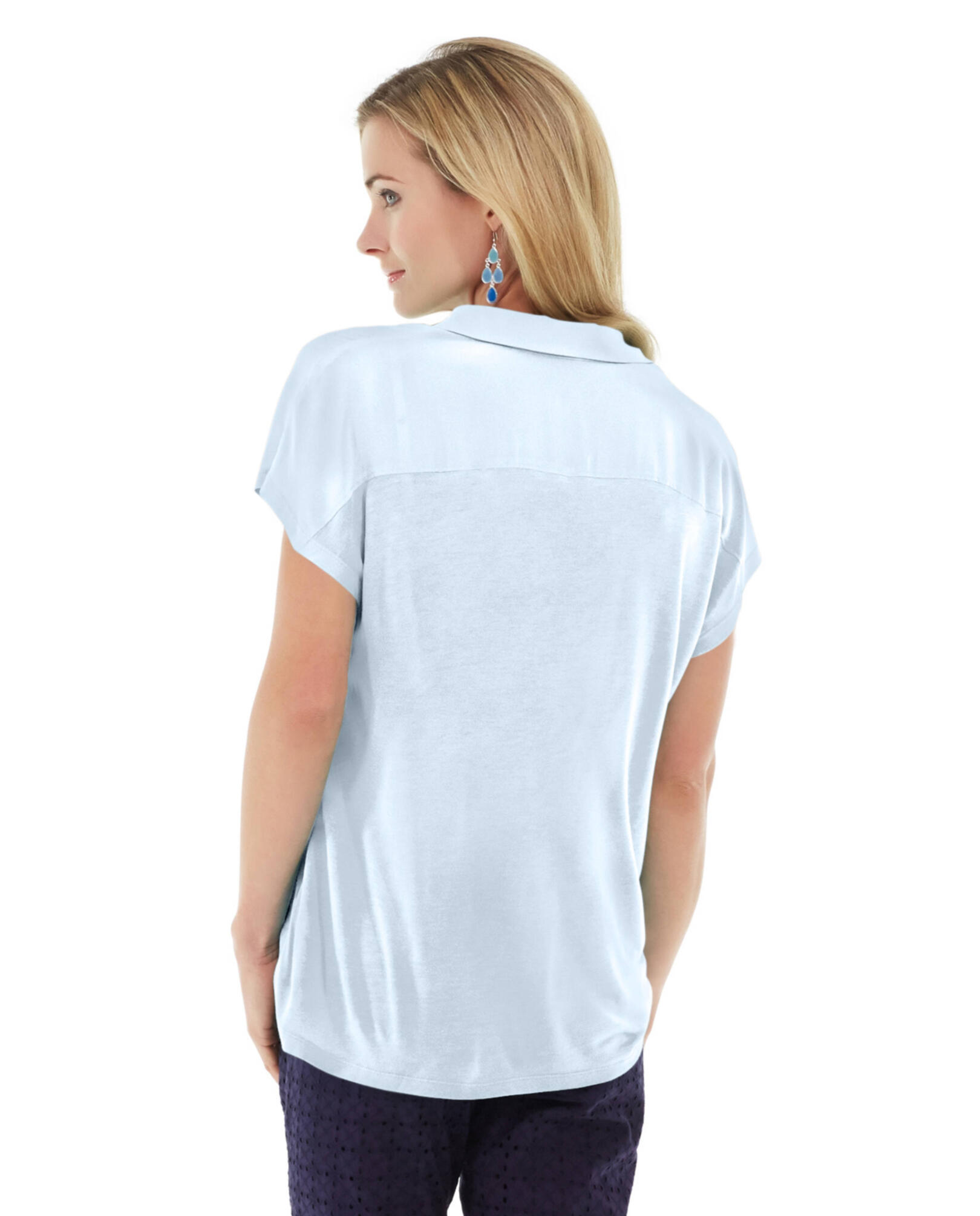 The Serena Blouse is made with a silk rayon blend that will keep you feeling light and airy. Resistant to watermarks, you can feel confident in any temperature while looking flawless.